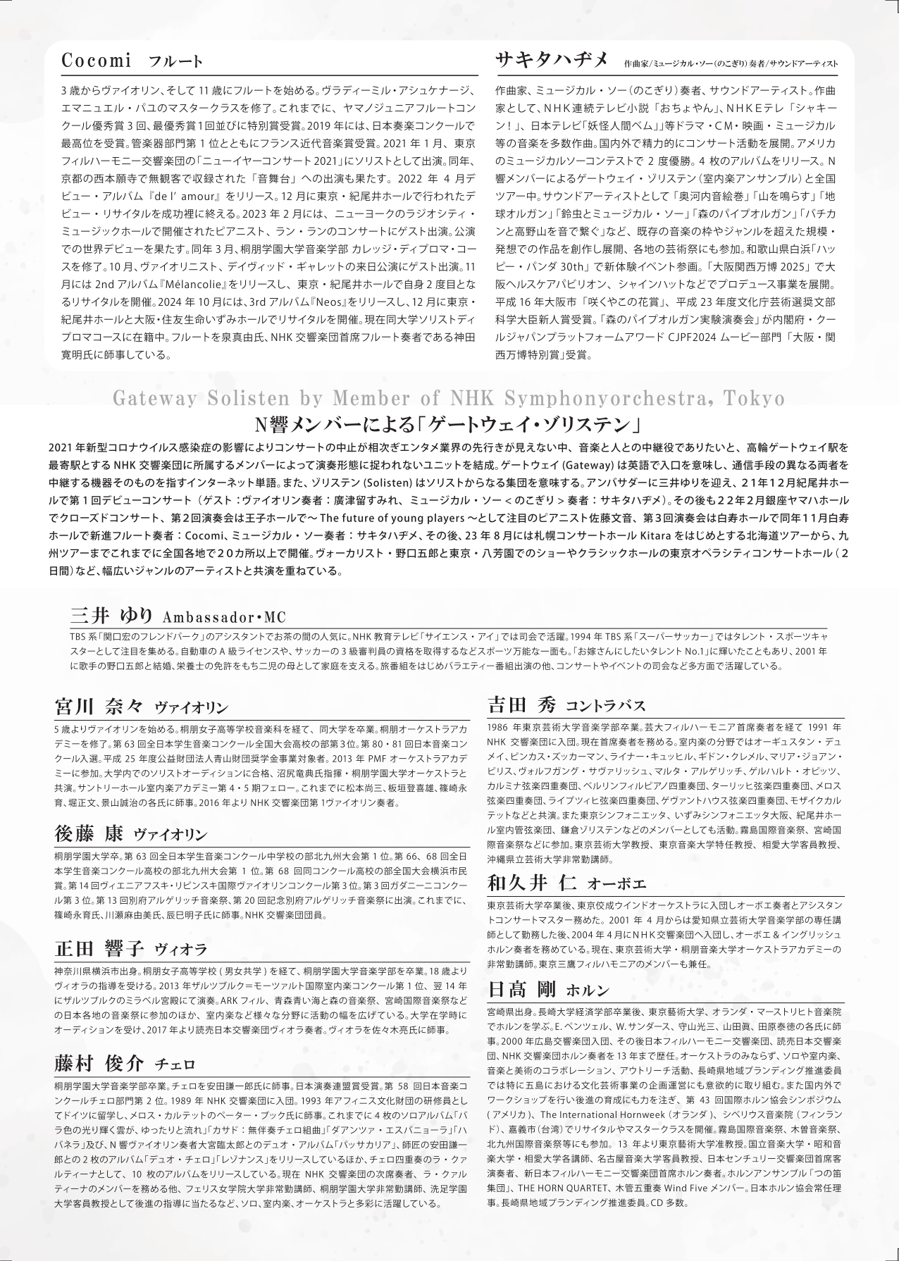 チケット取扱い EVENT N響メンバーによるゲートウェイ・ゾリステン ~Cocomi&サキタハヂメを迎えて~ 先行発売 10/4(土)/ 一般発売 10/11(土) 開催日:2026年1月31日(土) 時間:開場14:30 開演15:00 料金:全指定席5,000円(当日500円増) 会場:野口遵記念館 お問い合わせ:野口遵記念館 ℡(0982)31-3337/延岡総合文化センター ℡(0982)22-1855 チラシ裏面 オンラインチケットはこちら 最終更新日: 2025.10.03 / 投稿日: 2025.08.28 カテゴリー: チケット取扱い チケット取扱い一覧
