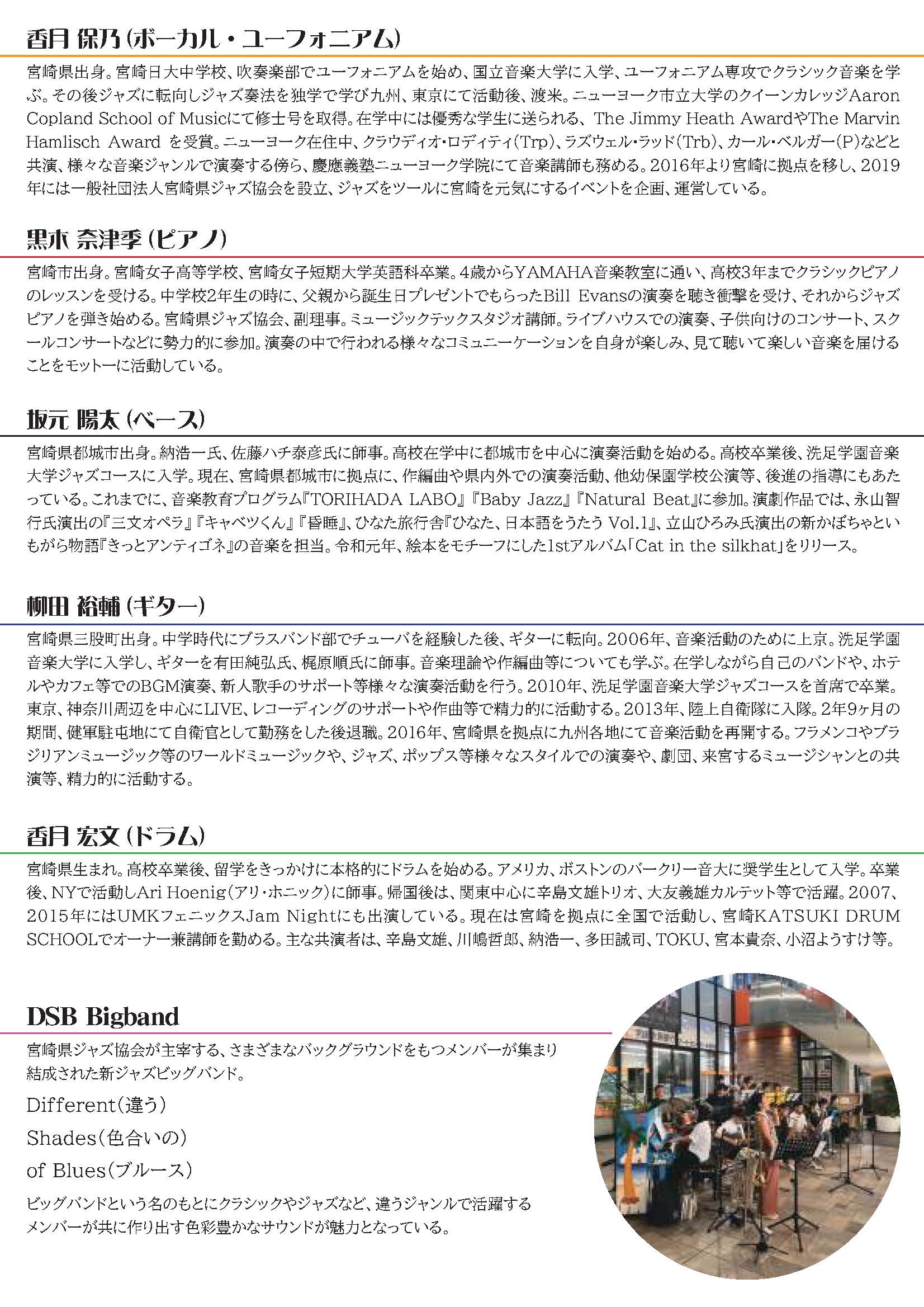 チケット取扱い EVENT 第30回宮崎国際音楽祭関連企画 香月保乃 Jazz Quintet with DSB Bigband CONCERT チケット発売中! 開催日:2025年12月6日(土) 時間:開場16:15 開演17:00 料金:全自由席(一般1,000円/高校生以下500円) ※未就学児膝上鑑賞無料 会場:野口遵記念館 ホール お問い合わせ:野口遵記念館 ℡(0982)31-3337/延岡総合文化センター ℡(0982)22-1855 チラシ裏面 オンラインチケットはこちら 最終更新日: 2025.10.06 / 投稿日: 2025.10.01 カテゴリー: チケット取扱い チケット取扱い一覧