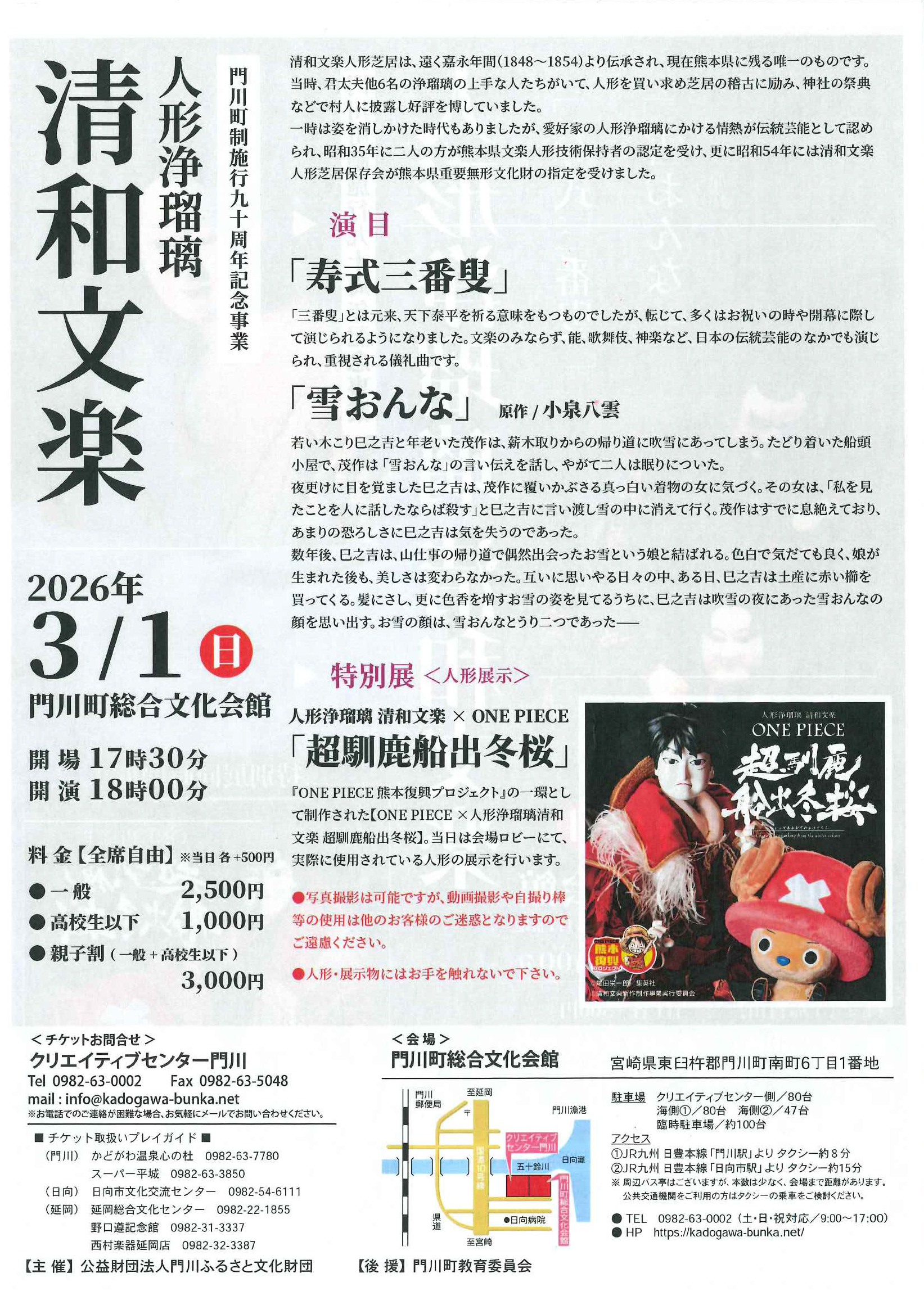 チケット取扱い EVENT 人形浄瑠璃 清和文楽 チケット発売中! 開催日:2026年3月1日(日) 時間:開場17:30 開演18:00 料金:全席自由(一般2,500円/高校生以下1,000円/親子割3,000円)※当日各500円増 会場:門川町総合文化会館 お問い合わせ:クリエイティブセンター門川 ℡(0982)63-0002 チラシ裏面 最終更新日: 2026.01.18 / 投稿日: 2025.12.20 カテゴリー: チケット取扱い チケット取扱い一覧